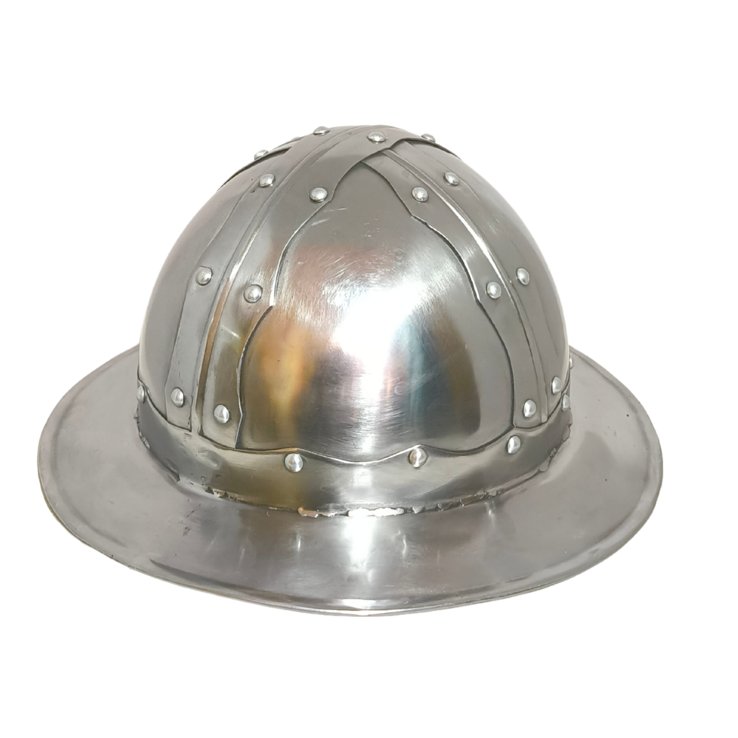 This is a handcrafted replica of the classic 16th–17th century Morion helmet, famously worn by European infantry soldiers and Spanish conquistadors. Made of polished steel with reinforced riveted bands, it features a wide brim for added protection against downward strikes. Lightweight yet durable, this helmet is perfect for historical reenactments, collections, or display.